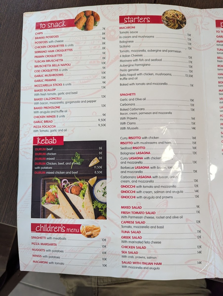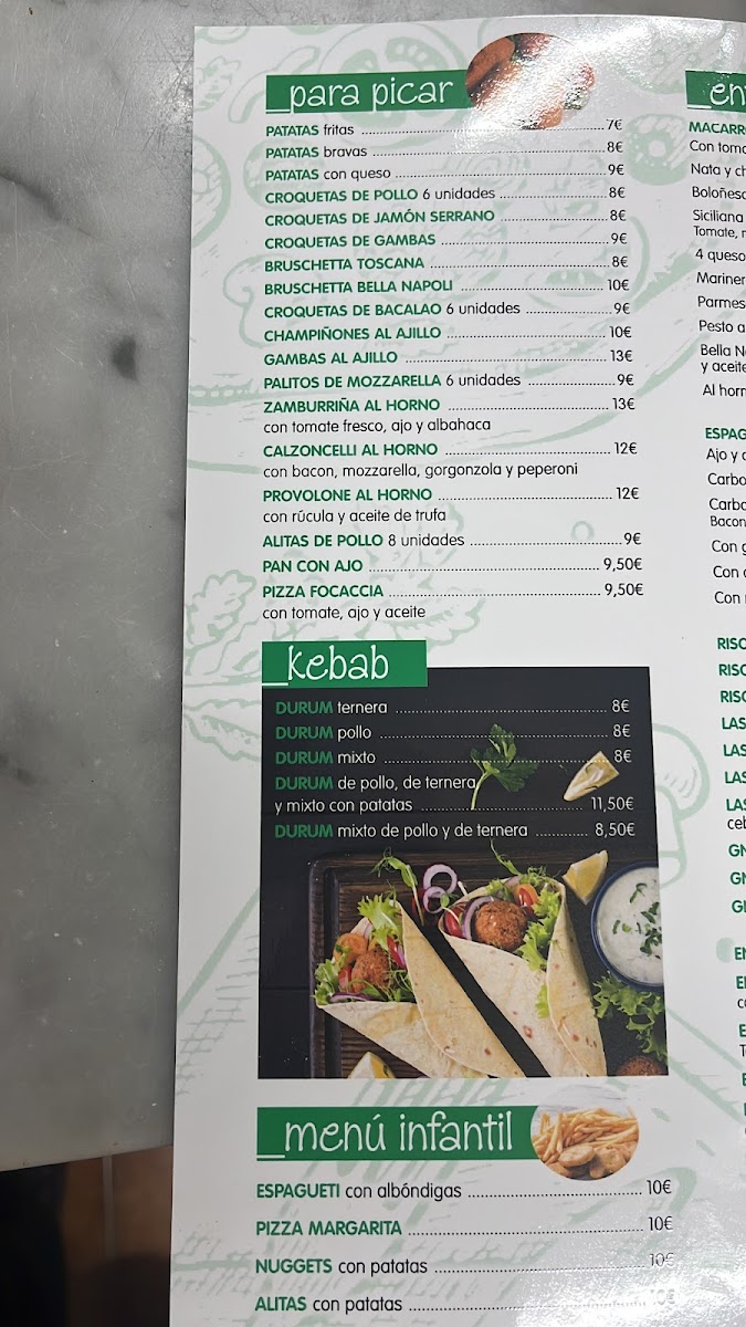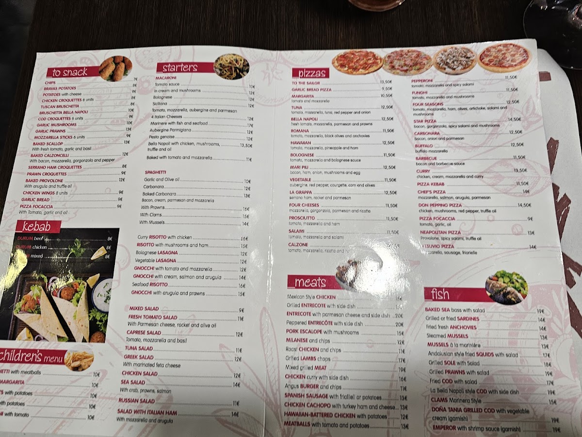 You’ll find a variety of pizzas featuring both classic and creative toppings, such as the Pizza Margherita, Pizza Calzone, and Pizza Kebab, alongside fresh pasta options like Pasta A la Carbonara and Espaguetis Con Gambas. Light starters like Steamed Mussels, Calamari Rings, and Garlic Bread complement the main choices well, creating a balanced selection of simple yet satisfying bites.